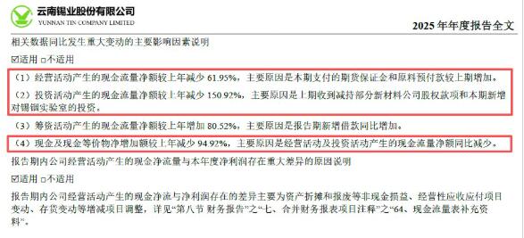 同时,公司投资活动产生的现金流量净额较上年减少150.92%,主要原因是上期收到减持部分新材料公司股权款项和本期新增对锡铟实验室的投资。经营性现金流和投资性现金流的双双下滑,导致锡业股份期末的现金及现金等价物净增加额较上年减少了94.92%。