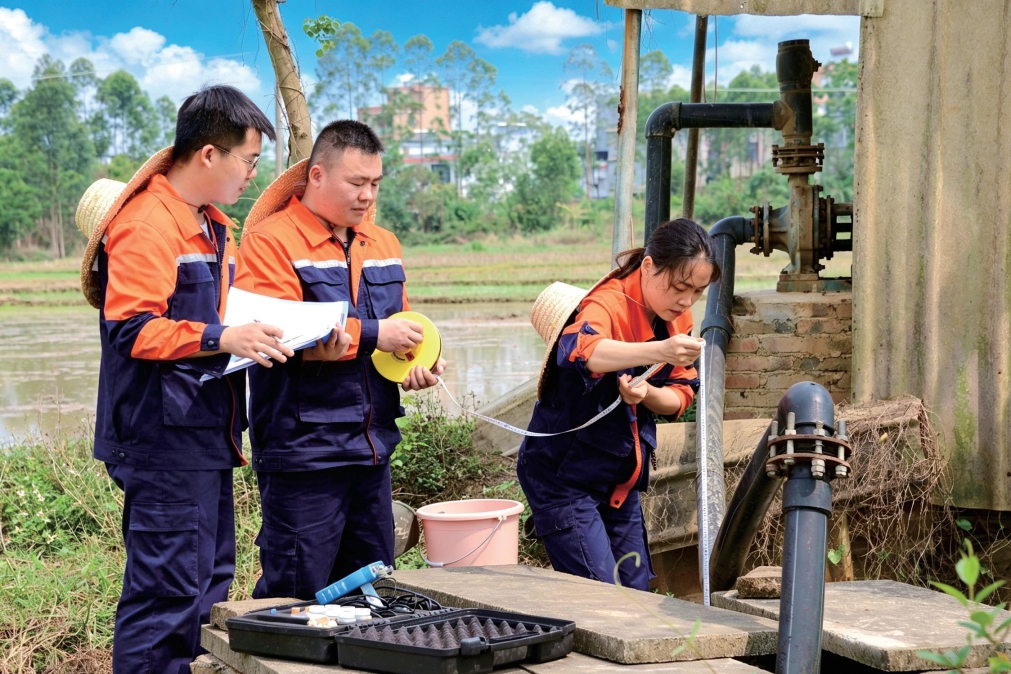 近日,广西三〇七核地质大队玉林市福绵地区地热资源前景调查项目组在广西玉林稳步推进野外调查工作,发现多处温度异常露头,初步摸清地热分布规律。图为项目组成员正在对地下水进行动态监测。杜小品 摄