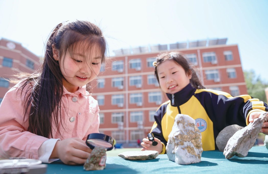 近日,中国地质调查局烟台海岸带地质调查中心赴当地外国语小学开展科普活动,将地质找矿知识、智能找矿预测与前沿科技带进校园,通过通俗语言和鲜活案例,讲解地球演化、岩石矿物形成和矿产资源对人类生产生活的重要意义,引导同学们树立资源保护理念,点亮科学探索梦想。图为同学们正在观察矿物标本。张晶 李杰 摄影报道