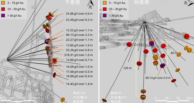 图2 5号矿 沿倾斜方向钻探结果,突出显示高品位矿段,边界品位为3.0克/吨。