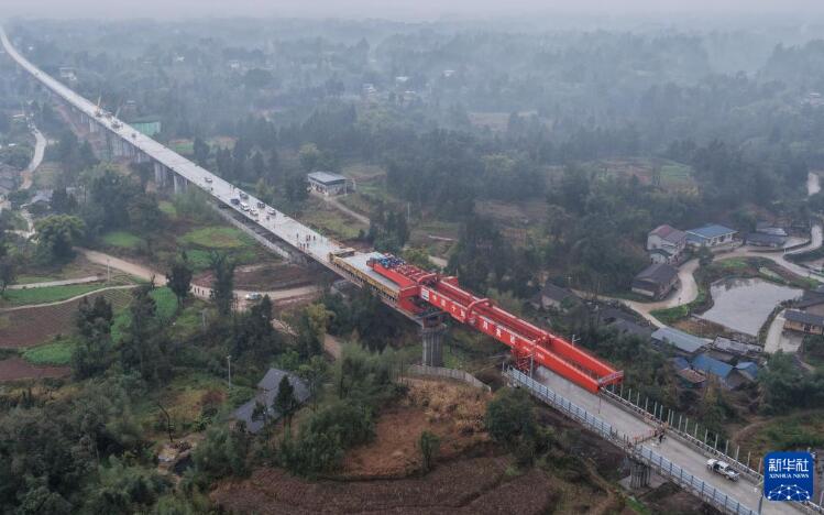 这是2月9日拍摄的成渝中线高铁重庆大足段第419榀箱梁架设现场(无人机照片)。 2月9日,随着最后一榀箱梁平稳落位,由中铁十四局承建的成渝中线高铁重庆大足段箱梁架设任务收官,为后续无砟轨道铺设、铺轨施工创造条件。 成渝中线高铁是我国“八纵八横”高铁网沿江通道的重要组成部分,正线全长292公里,设计时速350公里。 新华社记者 陈诚 摄