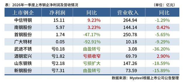 据Mysteel统计,截至4月23日,共有8家上市钢企公布2026年一季度业绩,合计实现营业收入约963.76亿元。 从净利润来看,4家公司实现盈利,中信特钢净利润15.11亿元排名第一,南钢股份5.97亿元排在第二,首钢股份1.74亿元位列第三。 从营业收入来看,中信特钢、首钢股份营收超250亿元。具体情况如下: